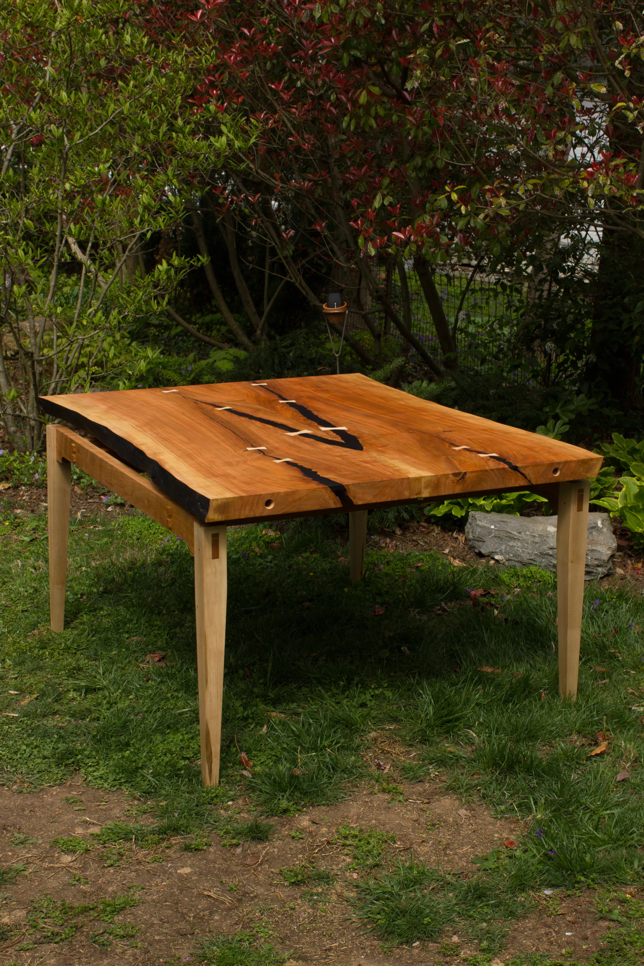 Old growth cherry and maple wood compose the piece and allow the contrasting burnt edge and black epoxy fill to define its details.